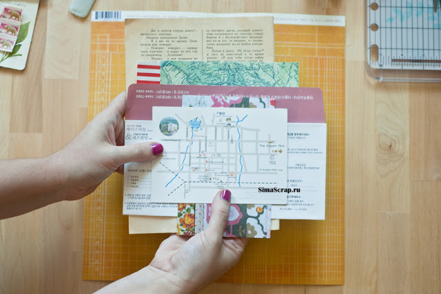главная фишка в том что не надо особо думать над конструкцией, нужно просто собрать все бумажки проткнуть их посередине, скрепить шпагатом, сложить пополам и все! а если у вас есть конверт из отеля или из города в котором вы побывали то он вообще станет карманом для всяких мелких памятных штук! например еще можно листы делать не из скраповых обрезков а из открыток и всяких бумажек из поездки и прям на них лепить фото и писать маркером!